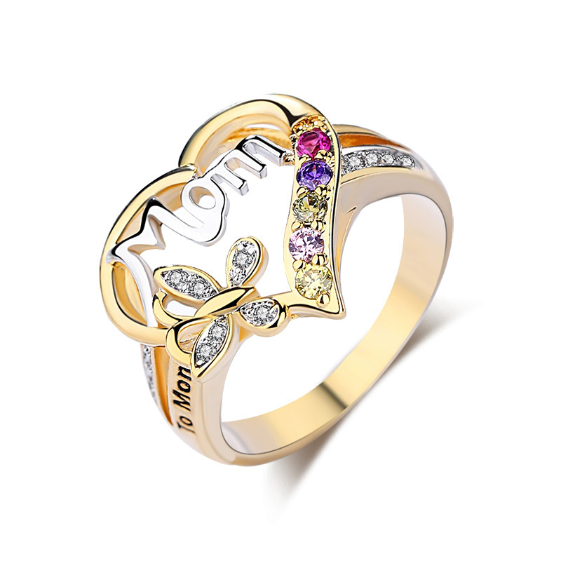 Mother's Day Gift Hollow Heart English Letter Love Mom Rhinestone Butterfly Finger Ring Jewelry Gift